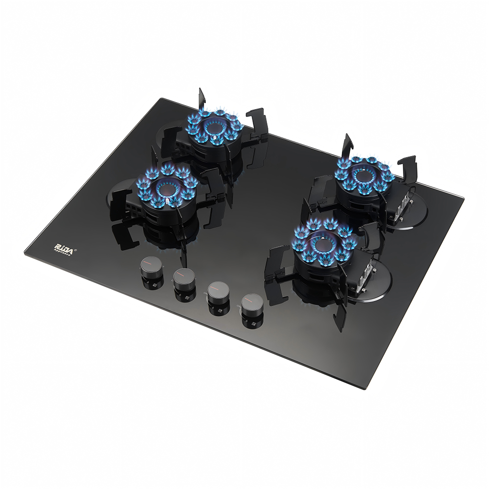 The definitive selling point of this 4-burner gas hob is its innovative flip-up burner design. Unlike static stoves that accumulate grease in hard-to-reach crevices, our burners can be lifted vertically to a 90-degree angle. This grants instant access to the glass surface underneath, allowing users to wipe the tempered glass panel clean in seconds. This user-centric engineering solves the most common complaint in kitchen maintenance, making this easy-clean gas stove a top choice for hygiene-conscious households.