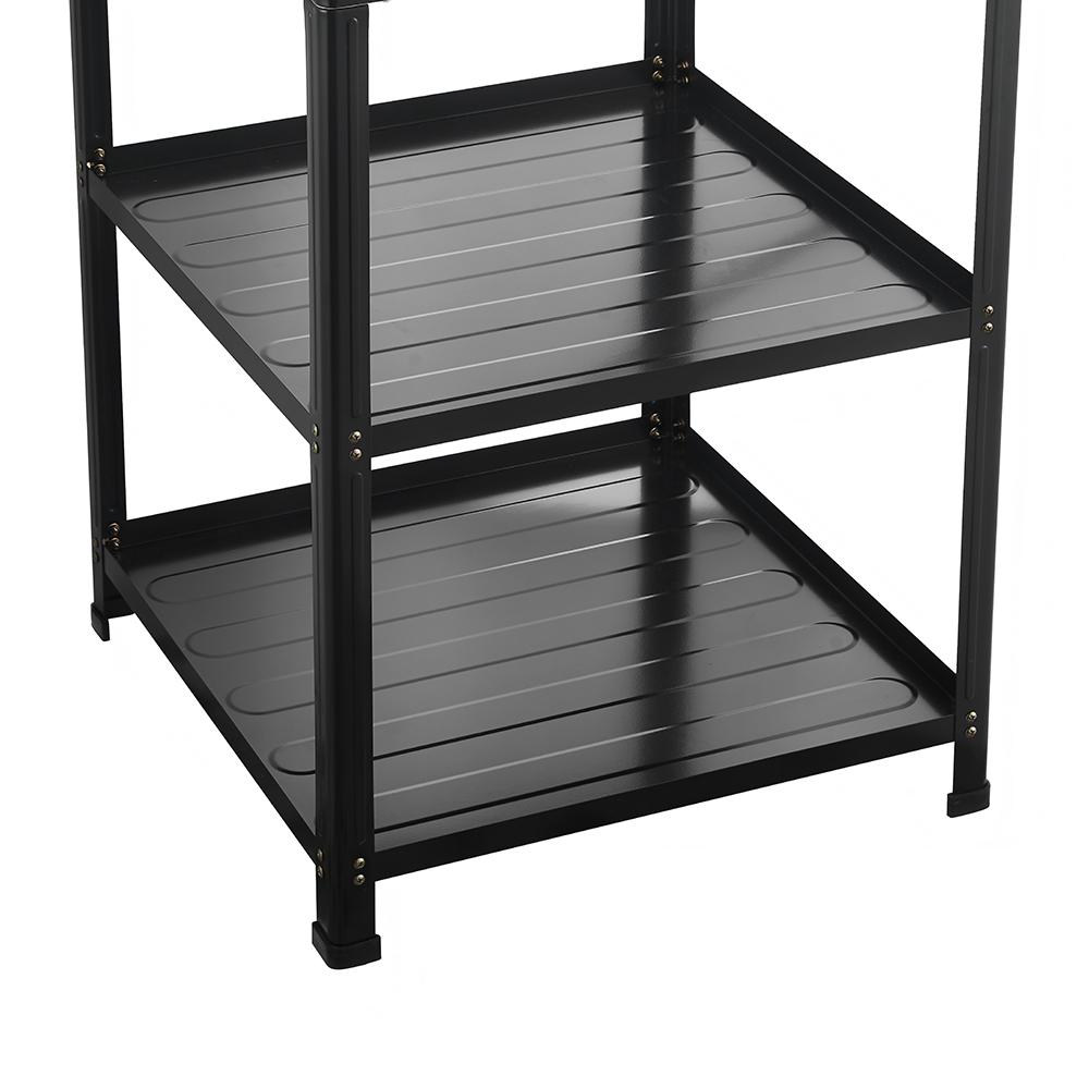 Setting up and operating your freestanding gas stove is simple — no electricity or complex installation required. First, assemble the stand and shelves according to the included instructions, placing the unit on a flat, stable, and well-ventilated surface. Connect the L-shaped iron gas pipe to your LPG cylinder or natural gas outlet, checking all fittings for a secure, leak-free seal (apply soapy water to joints to test for bubbles). To cook, turn the control knob to the desired burner position, hold a lit match or lighter near the burner opening, and rotate the knob to release gas — the flame will ignite immediately. Adjust the knob to control flame size from low to high. After cooking, turn all knobs firmly to the "off" position and close the main gas supply valve. Always keep the area around the stove clear of flammable materials and ensure adequate ventilation during use.