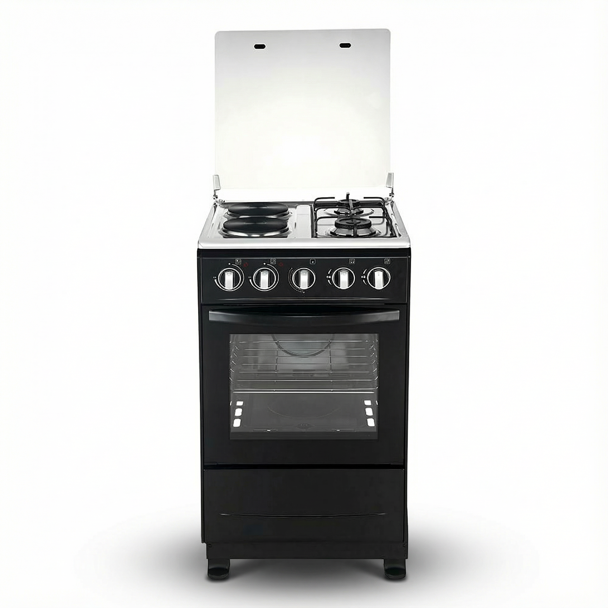 Unlike standard gas ovens, this range integrates a high-efficiency 2.0KW electric oven. The electric heating element provides dry, uniform heat within the spacious 55L oven cavity, ensuring superior results for baking cakes, breads, and roasting meats. Includes a chromed oven grill and bottom tray. This feature targets customers looking for the precision of an electric oven combined with the speed of a gas cooktop, often referred to as a dual fuel range.