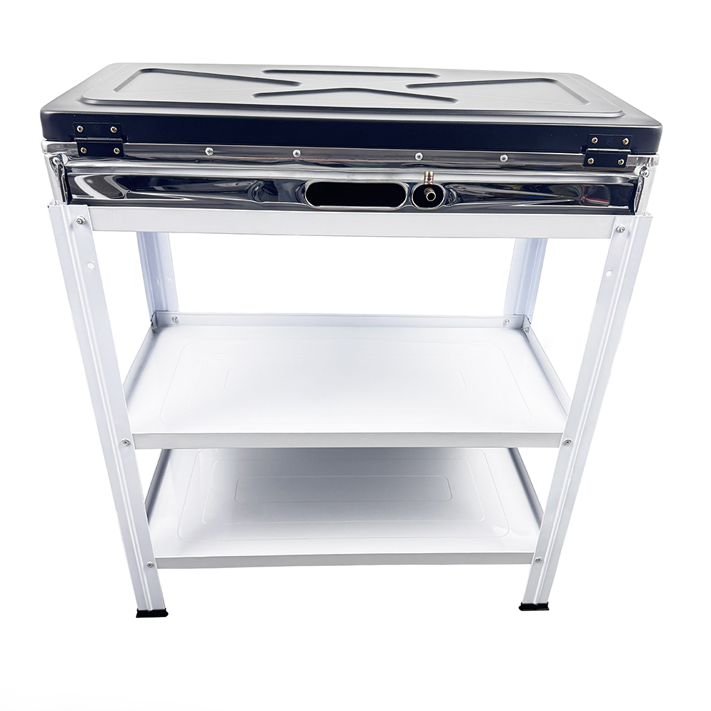 Setup and operation are quick, simple, and require no professional installation. Assemble the frame and shelf tiers on a flat, stable, well-ventilated surface. Connect the gas pipe securely to your LPG cylinder or natural gas outlet, then check all joints with soapy water to ensure a leak-free seal. Lift the dust-proof top cover to expose the burners. To ignite, simply turn the control knob — the automatic ignition valve releases gas and sparks simultaneously, producing an instant flame. Adjust the knob to set your desired heat level. After cooking, turn all knobs to "off," close the main gas valve, and fold the protective cover down to keep the cooktop clean and dust-free.